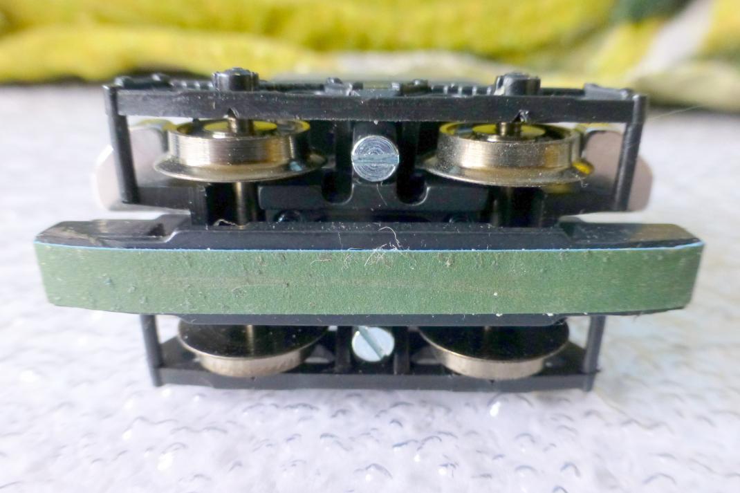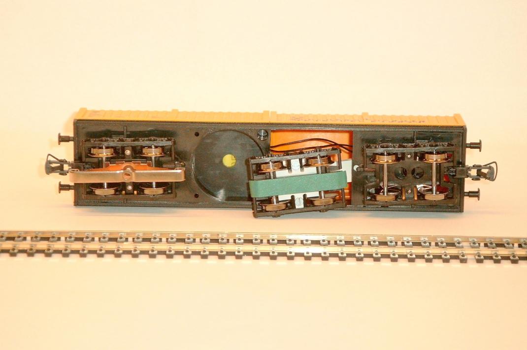 Kernstück des Mittelleitereinigungswagen ist der in einem Drehgestell fixierte, oszillierende Schleifschuh, der mit einem Reinigungsstreifen belegt ist. Die bei Gleisbögen und speziell bei Weichenanfahrt gleismittig und höhenregulierte Poliertechnik wirkt stetig am Mittelleiter. Somit werden Oxyd- und Schmutzschichten hocheffizient am Punktkontakt von Märklin1-M-, K- und C-Gleisen sowie von Trix-Express-Gleisen beseitig. Der gekapselte Antrieb ist optimal gegen Verschmutzung geschützt. Der Antriebsblock wird durch eine Stützplatte im Wagenchassis gehalten.
